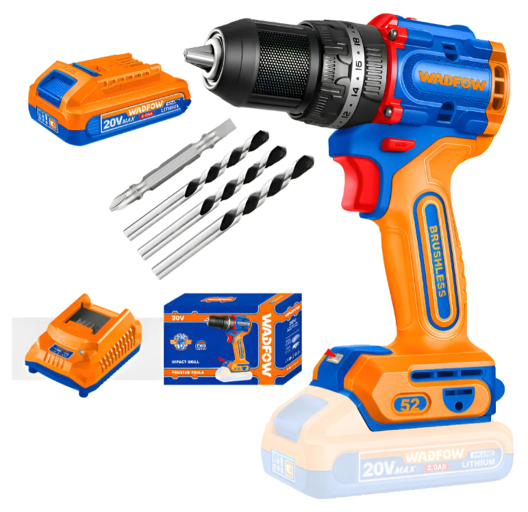 TALADRO ATORNILLADOR C/PERCUTOR A BATERIA P20S 20V BRUSHLESS 52NM C/BAT Y CARGADOR WADFOW cantidad